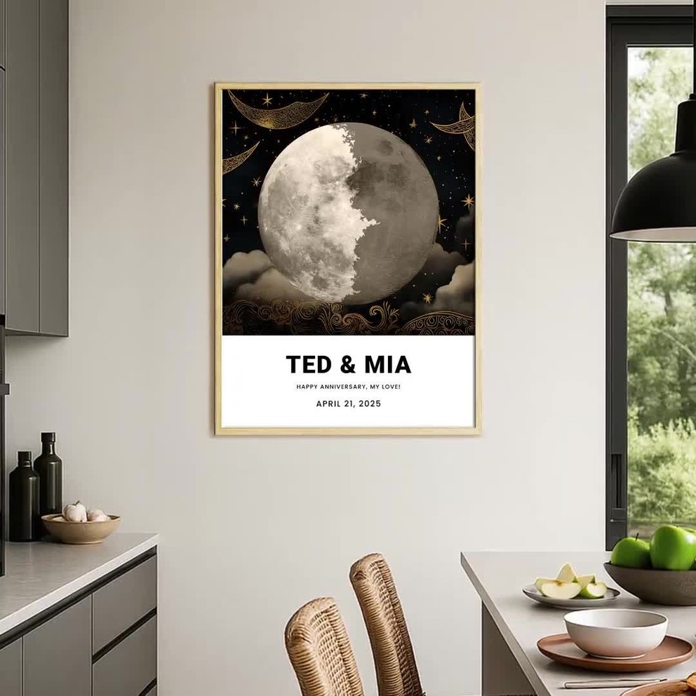 Create custom moon art using any date and location to see the moon's phase as it was when you met, when you fell in love, your wedding day, and more.Â