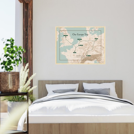 Our Our Europe Trip Poster - Route Map is available in the always ideal Landscape orientation, or it can be fully customized to your liking. Perfect for any space, this work comes in various size options and finishing materials. In fact, your Our Europe Trip Poster - Route Map will have a classic, gallery-quality look when you choose from Matte Poster, Metal Frame, Canvas, Wood Print, and more. Don't hesitate! Give your walls the makeover they deserve!